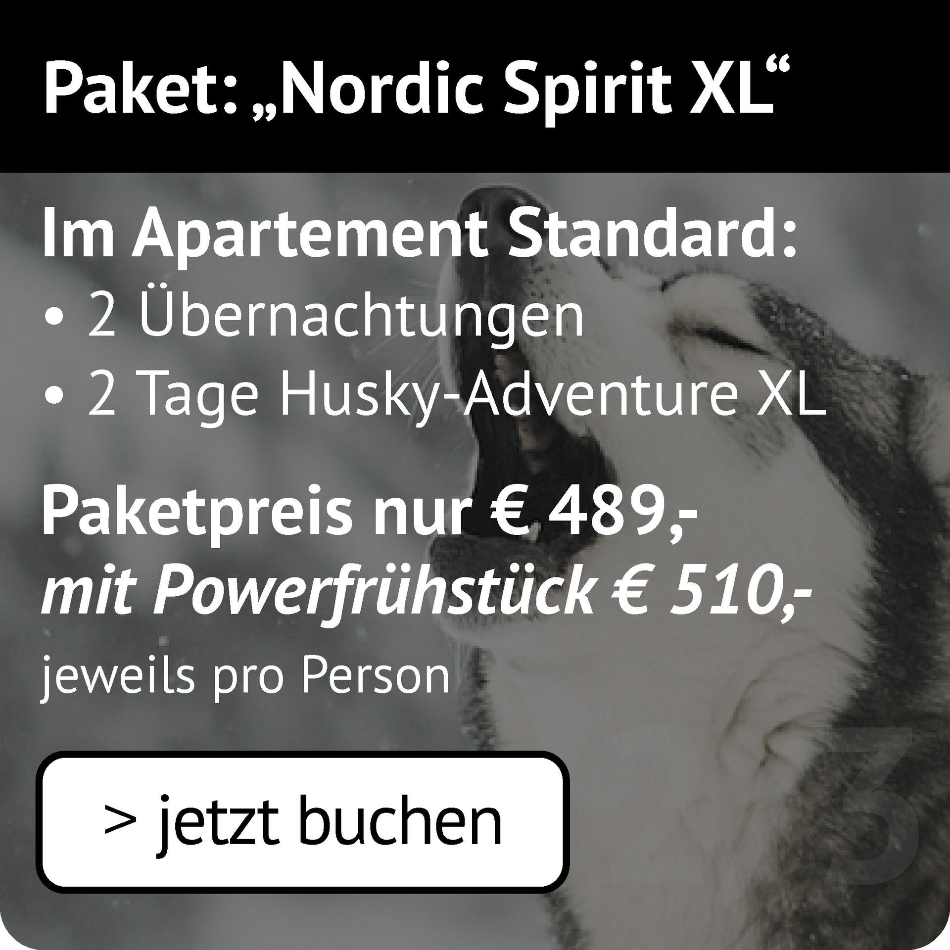 Ein Wochenende voller Energie, Natur und Emotion – erleben Sie die Faszination der Huskys hautnah, kombiniert mit Entspannung und original nordischem Ambiente.